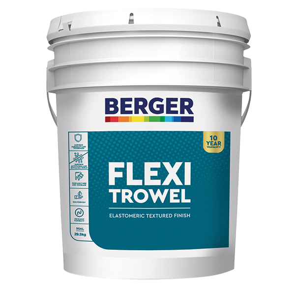Berger Flexi Trowel is a premium quality elastomeric trowel finish with superior, permanent flexibility, excellent adhesion, and long-term durability to interior and exterior surfaces. This one-coat application is available in Ultra Fine, Fine, Coarse and Ultra Coarse in the Colour Library, in addition to Coral Stone. Berger Flexi Trowel is designed to provide good elasticity and to mask uneven rendered surfaces. It can be applied to previously emulsion-painted surfaces with appropriate surface preparation.