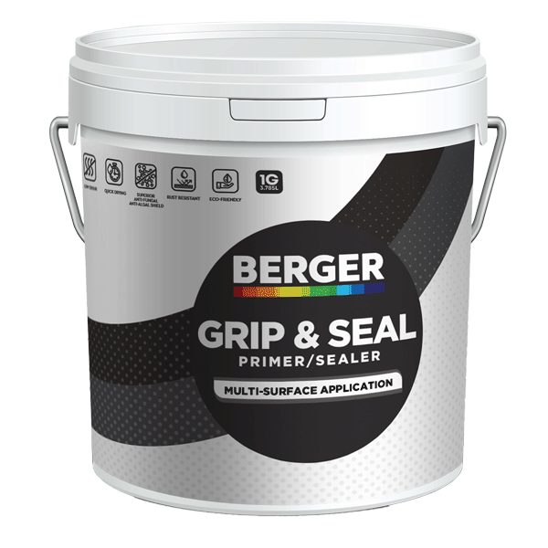 A vinyl veova, water-based, primer, specially formulated with the latest high performance resins for application to a variety of surfaces including concrete, wood, drywall, masonry, aluminium and galvanized metal surfaces. Its superior stain-blocking, sealing qualities, anti-rust properties and excellent adhesion make Berger Grip&Seal Multi-Surface Stain-Blocking Sealer-Primer an outstanding base coat for the application of topcoats to new and previously painted wall, wood and metal. This versatile primer is fast-drying and can be tinted.