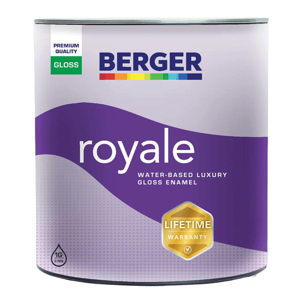 Premium quality, water based, low-odour, gloss enamel for interior and exterior wall, wood and metal in tropical conditions. A hard-wearing finish with a performance comparable to oil paints. Great in bathrooms, kitchens and laundries. The ideal paint solution for occupied living spaces as an excellent alternative to oil paint. Used in conjunction with Berger Grip & Seal, Royale Water-Based Luxury Gloss Enamel is great on interior wood and metal. In addition Royale Luxury Gloss Enamel is backed by a 7-year warranty.
